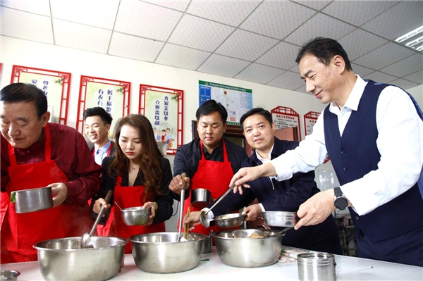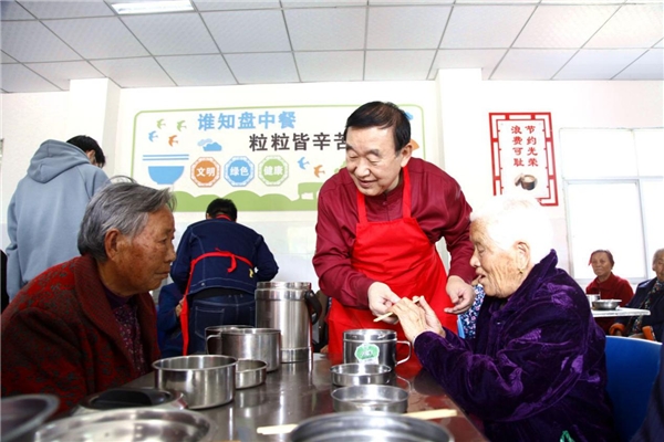 慰問演出結(jié)束后,“同心圓夢藝術(shù)團”文藝志愿者來到新崗村幸福食堂,為村里留守的孤寡老人和殘疾老人當起了“食堂服務員”,與老人們共同歡度佳節(jié);