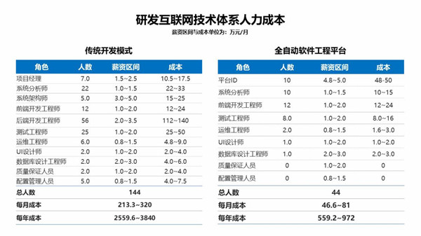 基于上述配置要求,“傳統(tǒng)開發(fā)模式”和“飛算全自動軟件工程平臺”兩者人力成本的相關(guān)費用對比如下所示: